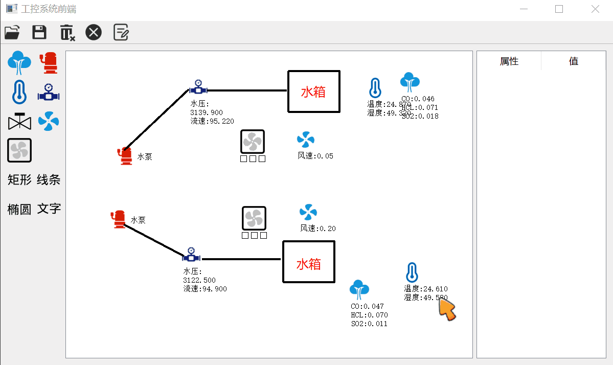 可以看到修改风机转速后,风速检测值的变化。各种自定义item也都有属性可以交互。